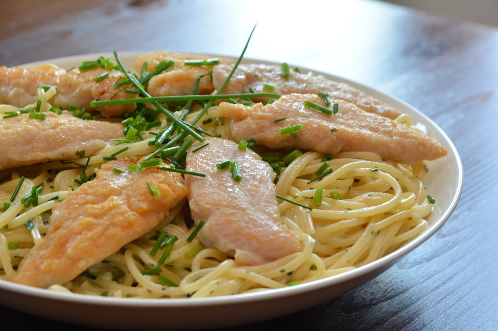 Hienonna valkosipulit ja kuulota niitä hetki pannulla. Lisää joukkoon kuohukerma, persilja sekä ruohosipulit. Mausta suolalla. Anna kastikkeen keittyä kasaan sillä aikaa, kun pasta kypsyy. Valuta pasta. Viimeistele kastike creme fraichella ja sekoita pastan joukkoon. Tarjoile broilerin sisäfileiden kanssa. Koristele ruohosipulilla.